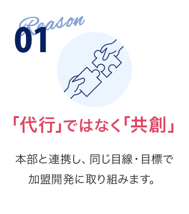 経験豊富な専門チームが本部と一体となって、加盟開発を仕組み化・実働化。 「人を動かす営業力」と「成果を出す実行力」で、着実に加盟を積み上げます。